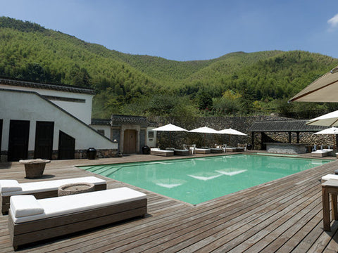 We arrive at our third and final destination after an unexpected delay caused by a bamboo truck blocking the one thru road. Painstakingly stacking each 10-meter bamboo pole by hand onto the transport in the late afternoon heat, the workers are clearly not impressed with a busload of models trying to pass. After an oven-like 45 minute wait, the truck moves on and we enter the gates of a gorgeous retreat nestled in a valley of tea fields. We’re so overheated from the bamboo debacle that we all fail the first temperature check. Ten minutes in the cool, tiled lobby brings us back down below 37C, the passing bar.