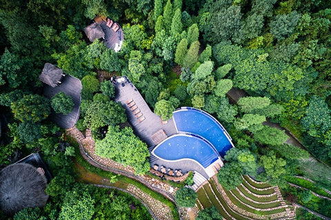 Luckily for us, we wake up to a hot, sunny morning and have two fabulous women ready to bring our swimwear to life. Our first stop is right up the hill from the house – Naked Castle. Originally built in 1910 by Scottish missionary Dr. Duncan Main, the European-style castle served as a summer retreat from steamy Shanghai. In 1926, Dr. Main retired to Scotland at age 71 and the castle served as a government bureau office and eventually as an inn. By 1960, the castle had fallen into such disrepair that it collapsed and was swallowed up by the forest. The ruins were discovered in 2007 by a lost mountain biker named Grant Horsfield, a South African native living in Shanghai. By 2017, he and his wife Delphine had reimagined the entire mountainside and built the castle we now arrived at by golf buggy.Wednesday, April 29th – it’s two days before the official May national holiday, but the castle is already full of vacationers. We manage to shoot around the guests at the infinity pool hanging off the side of the mountaintop – no small feat.